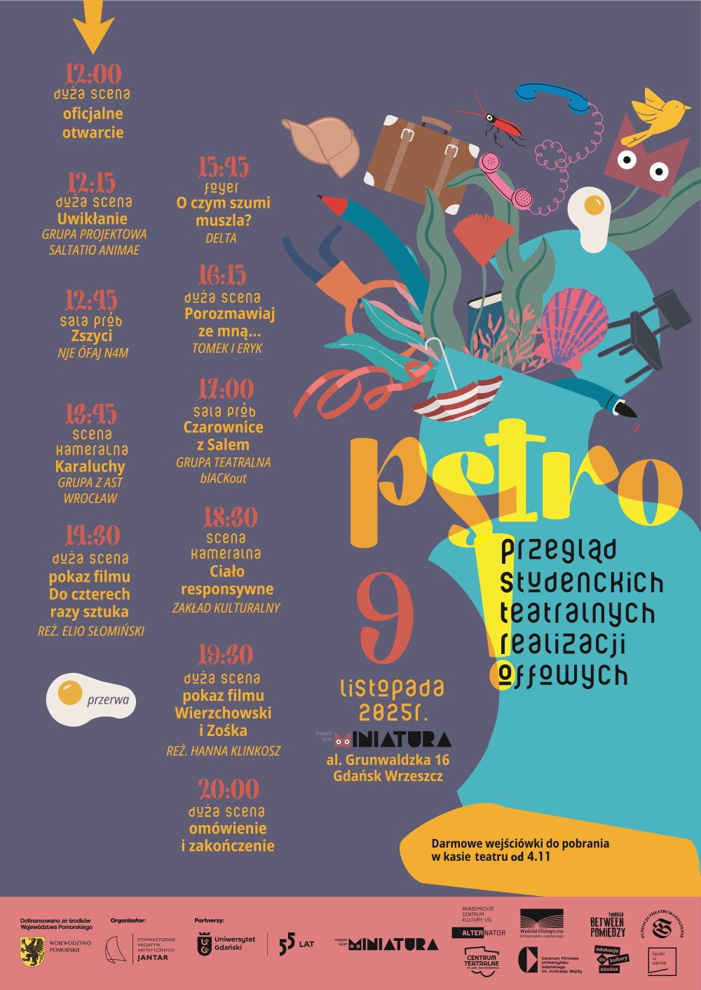 Darmowe bilety do odbioru w kasie biletowej Teatru Miniatura od 4 listopada. Bilet na każdy spektakl trzeba odebrać osobno. Liczba miejsc jest ograniczona.